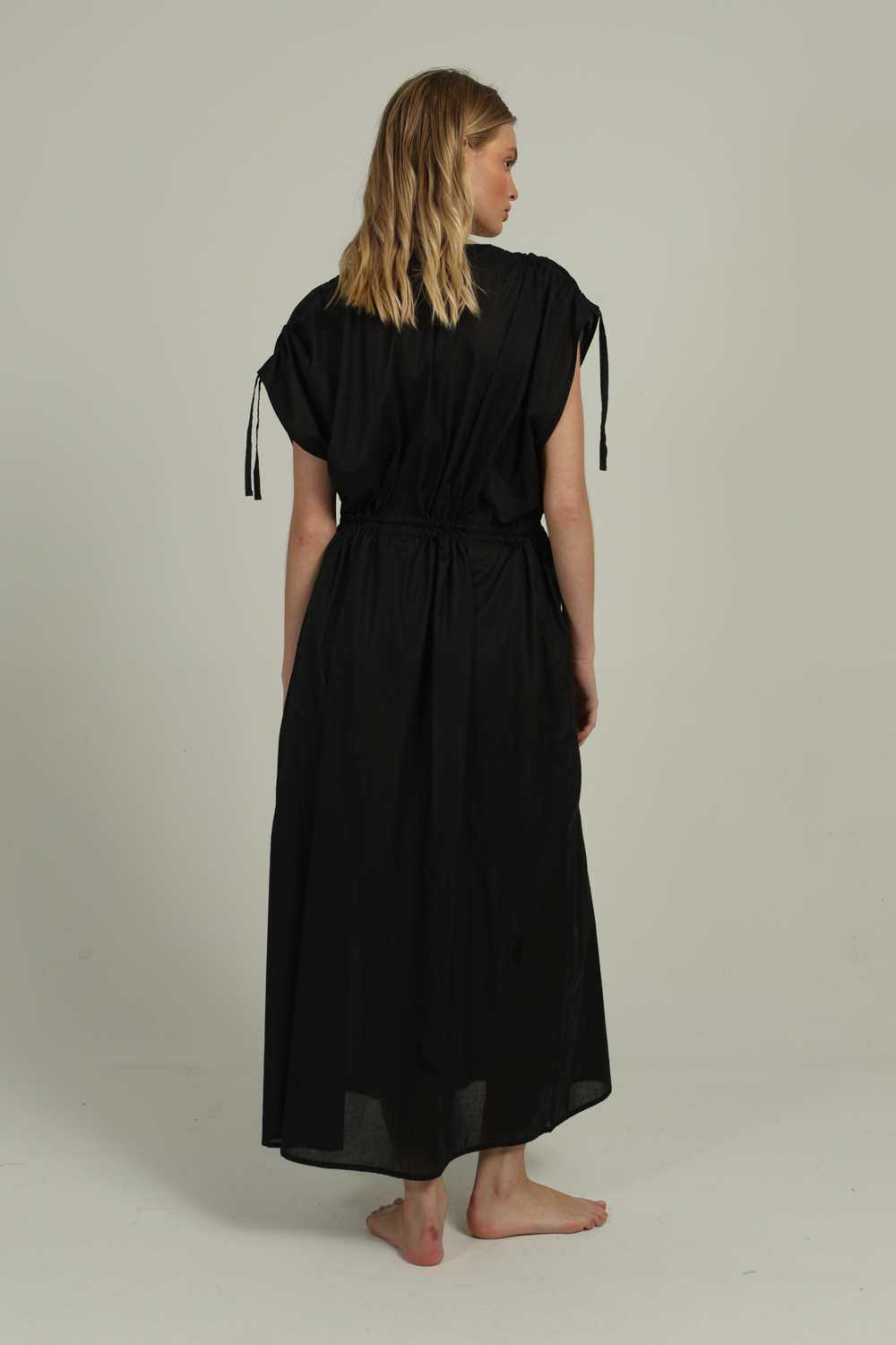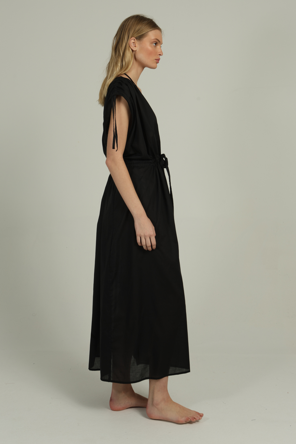 A relaxed full-length dress with a fluid silhouette and adjustable drawstring waist. Designed with shoulder ties for a customizable fit and effortless shape. Style it loose or gathered — it’s the ideal throw-on over any of our bikinis.