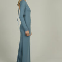 Refined simplicity with an unexpected twist. ELSA DRESS Â is a long-sleeve maxi dress with a graceful bateau neckline and a dramatic low-cut back, held by delicate ties. Designed for a close fit through the torso before falling into a soft, flared hem. Understated from the front, unforgettable from the back.