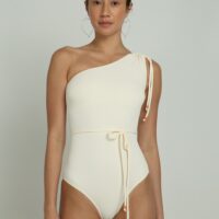 The EZRA one-piece swimsuit features a stylish one-shoulder design with an adjustable tie on the shoulder for a customizable fit. A matching tie belt at the waist enhances the silhouette, adding a chic touch. Made from soft, textured fabric, this swimsuit offers both comfort and a unique look.