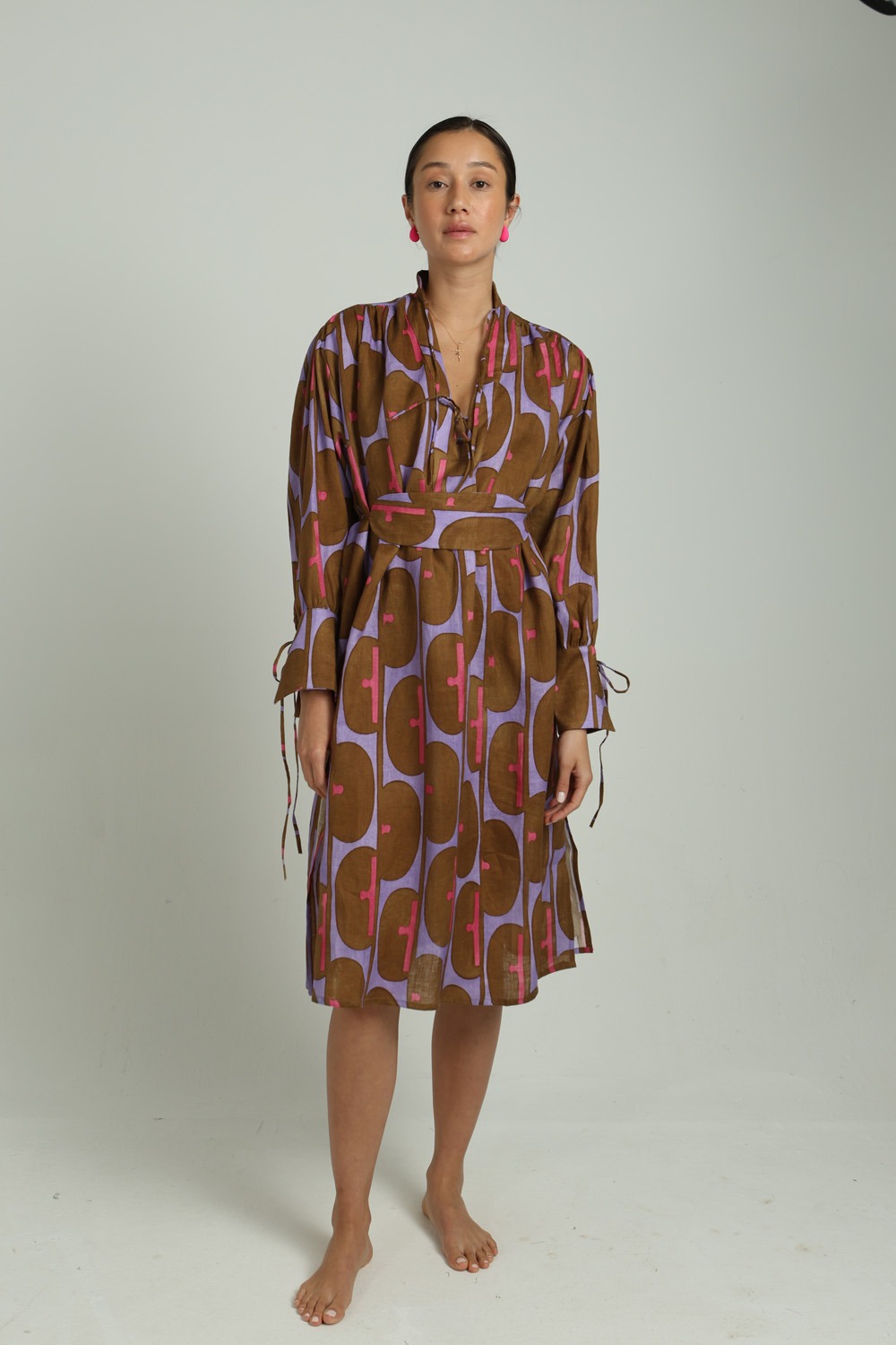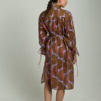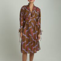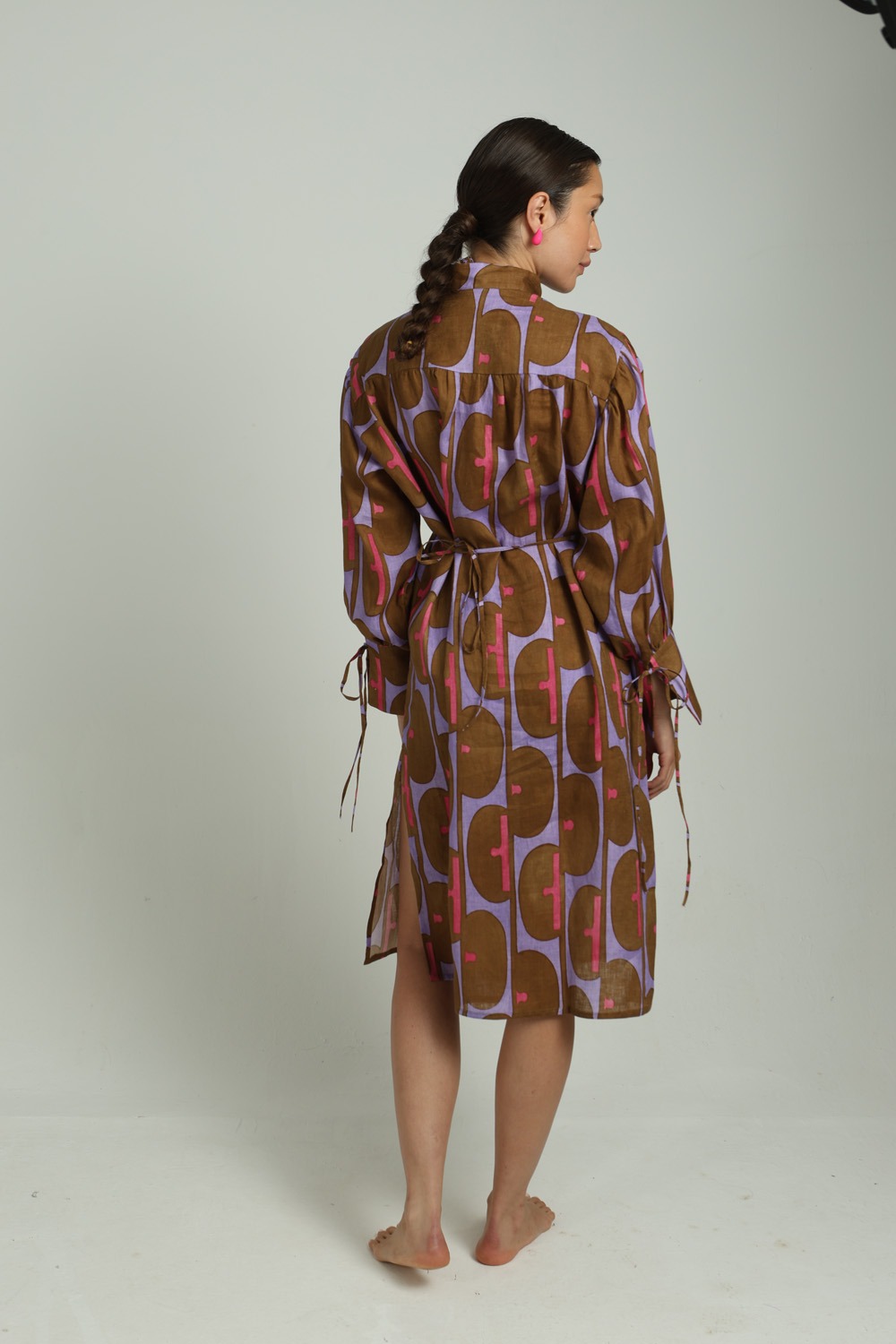 The GRACELYNN is a midi, loose dress, with a shirt-like top part with tie details at the front and on the sleeves, as well as a thick belt snatching the waist. Its slits at the side of the dress make it a breathable and relaxing choice for spring and summer.