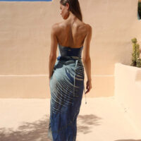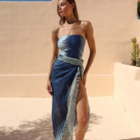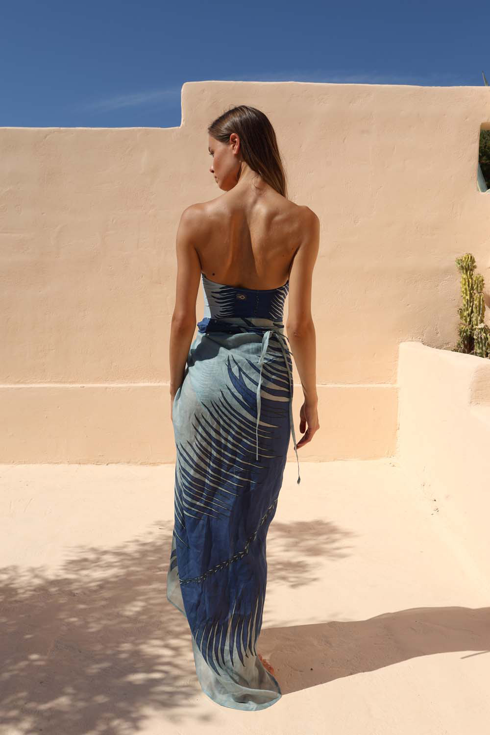 The INGRID PAREO is a wrap-style that drapes around the waist and extends to just above the ankles. It can be tied, creating a gathered and slightly asymmetrical look. The fabrics flow softly, suggesting a comfortable and breezy feel.